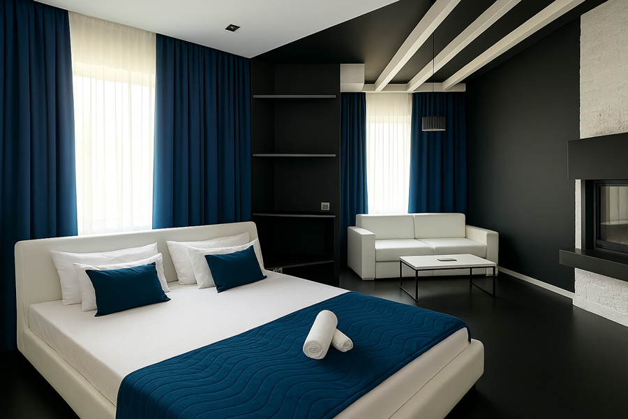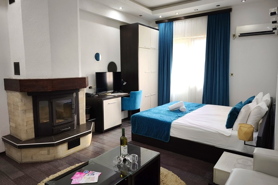 Делукс стая „Купидон“ (за 2 до 4 човека) съдържа: голямо легло (200см х160см), разтегателен диван, камина с камина.